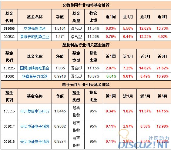 近一周,文教休闲、塑胶制品、电子元件行业上涨,涨幅分别为:0.80%、0.73%、0.18%。相关基金推荐如下: