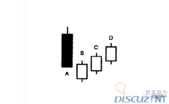 在这个形态中,有四根K线。其中第一根就是我们常见的大阴线,大阴线背后的意义,就是市场处于空头控制中。而后面的k线B、C、D一次走出来,后面三个K线的特点是他们是连续的三根上涨K线,并且高点和低点也逐渐抬高。