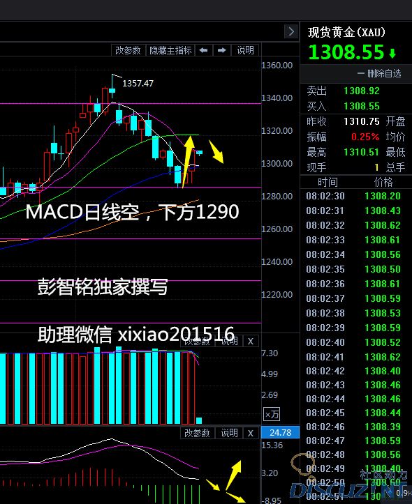 今日早间黄金自1305位置上行势如破竹,冲高至1314美元位置,然而智铭也讲过,黄金上方阻力位在1315--1317位置,多头行情并不那么充足,目前黄金再次回落至1302美元/盎司位置,企稳于千三之三。美朝嘴仗也并未再次升级。今日不管是做多的还是之后做空的,相信大家都有获利 从目前黄金走势看黄金处于多空胶着状态。刚刚站稳布林上轨的黄金来个急转弯下探至中轨附近,承压于40日均线之下,MACD中快慢线平行运行,绿色柱能并未持续放量和缩量、KDJ中有金叉拐头向上趋势,所以智铭预测目前黄金将短线回调,上方看1310位置。延续白天建议,高空为主,低多为辅.