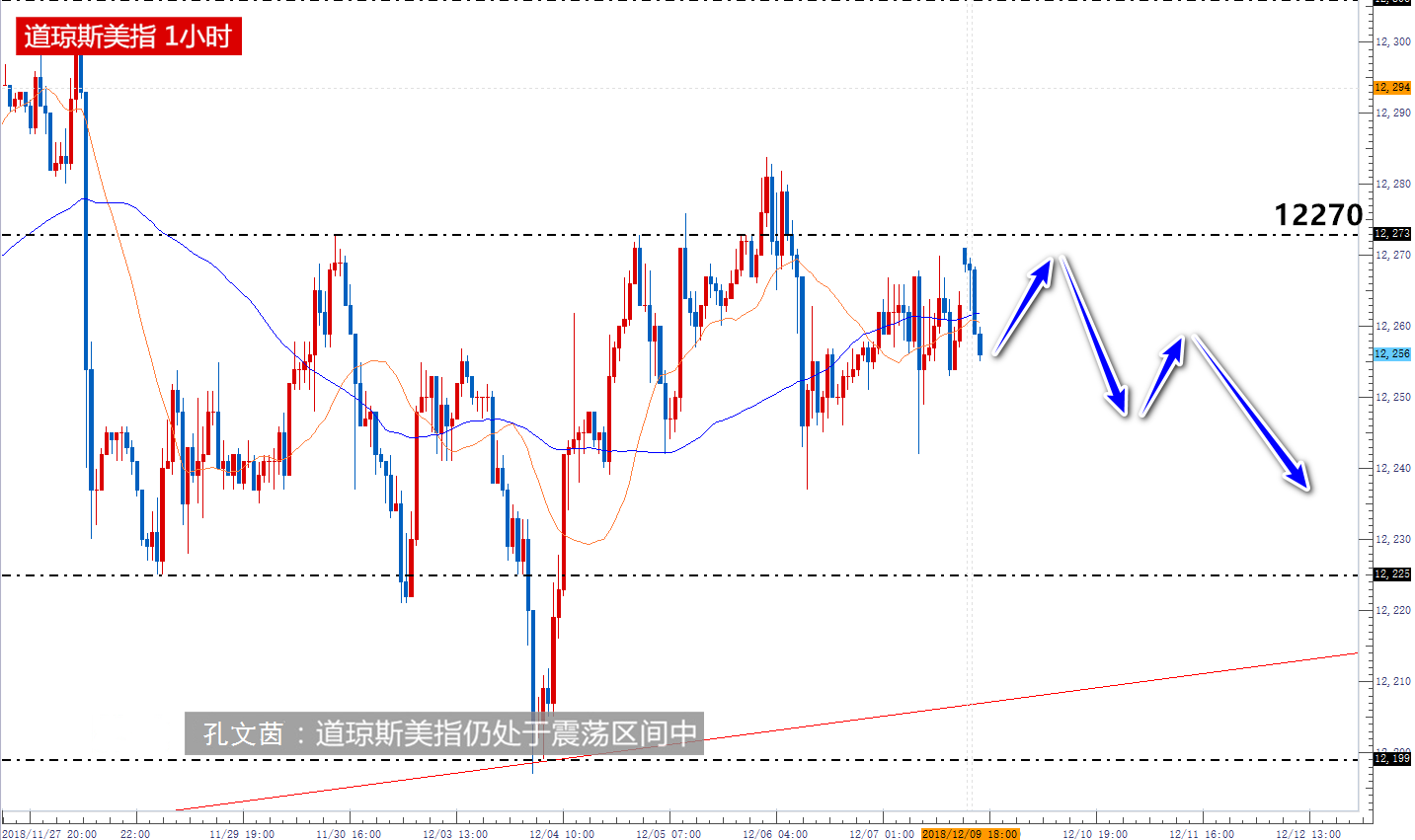 道琼斯美指一周半以来,大致维持在震荡中,区间上轨为12270,下轨为12220,期间虽有突破,但也很快回到该区间中,即使在非农期间也以盘整为主。本周开盘后,美指正处于区间上轨附近,收到阻力日内开始下跌,小时级别上MA20下穿MA60,空头动能较强,预计将开始回落。