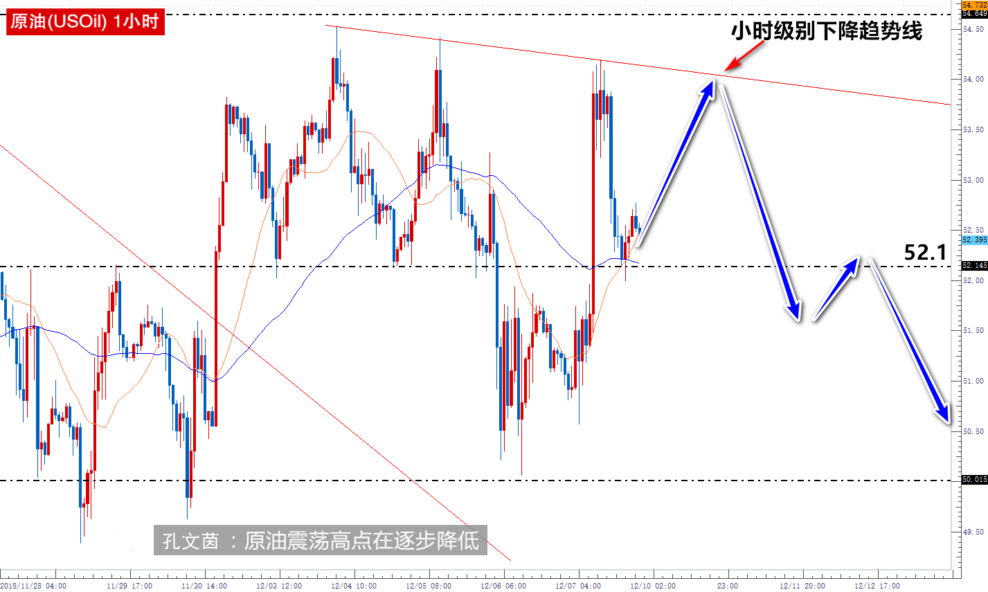 原油在突破此前的4小时级别下降通道后,开始止跌并陷入震荡中。震荡高点为54.6,低点为50整数关口。上周五在消息面刺激下,原油开始一轮快速上涨,但在2周高点附近受阻明显,触及后再次转跌。目前原油近期高点正在逐步降低,形成小时级别下降趋势线,原油选择高空低多,直至有效破位。