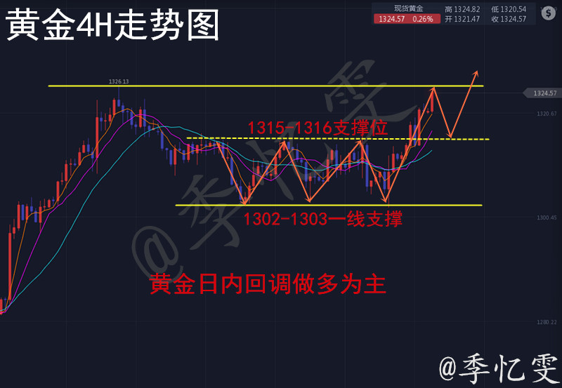 黄金的本轮上涨其实不是很强势,没能彻底涨破前高1326走出一个新区间,而细数上周走势可以发现,前半周多空震荡,后半周多空洗盘,周五慢涨走出破位走势,美盘多空拉锯最终点燃市场情绪高位收阳,但如橡皮筋般的走势也可看出当前的黄金的涨幅动能仍然不是特别强势,单边上涨的情况不易出现,我们还是要以震荡上行来对待,而本周早盘则先看上方1323/26压制点,震荡回落跟进多单来操作。