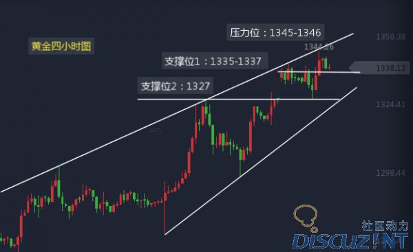 从4小时的形态看,昨日的行情开盘在1333.5的位置后行情回踩1331.7的位置后行情小幅拉升给出1338.3的位置后行情回落,4小时形成射击之星后行情加速下行最低给到了1326的位置后行情受到基本面推升强势拉升4小时行程低位锤头后行情加速拉升,最高触及到了1344.2的位置后行情整理最终日线收线在了1339.7的位置后,日线以一根下影线长于上影线的大阳线收尾,而这样的大阳线收尾后,今日的行情继续多。