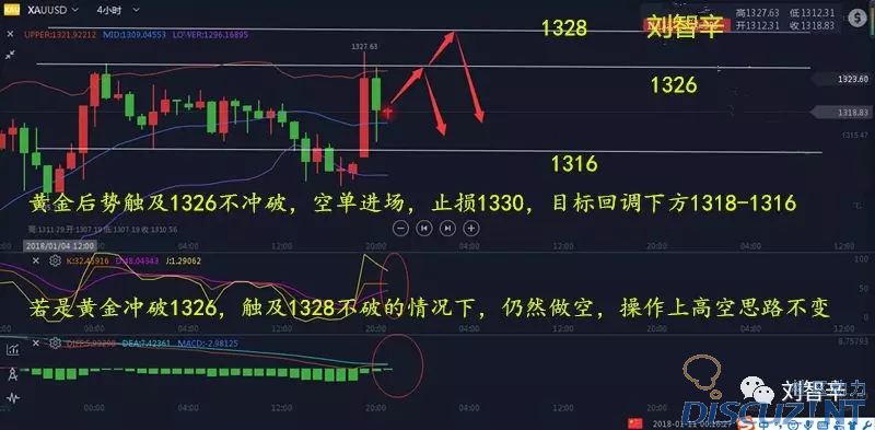 黄金后势触及1326不冲破,空单进场,止损1330,目标回调下方1318-1316;若是黄金冲破1326,触及1328不破的情况下,仍然做空,操作上高空思路不变!