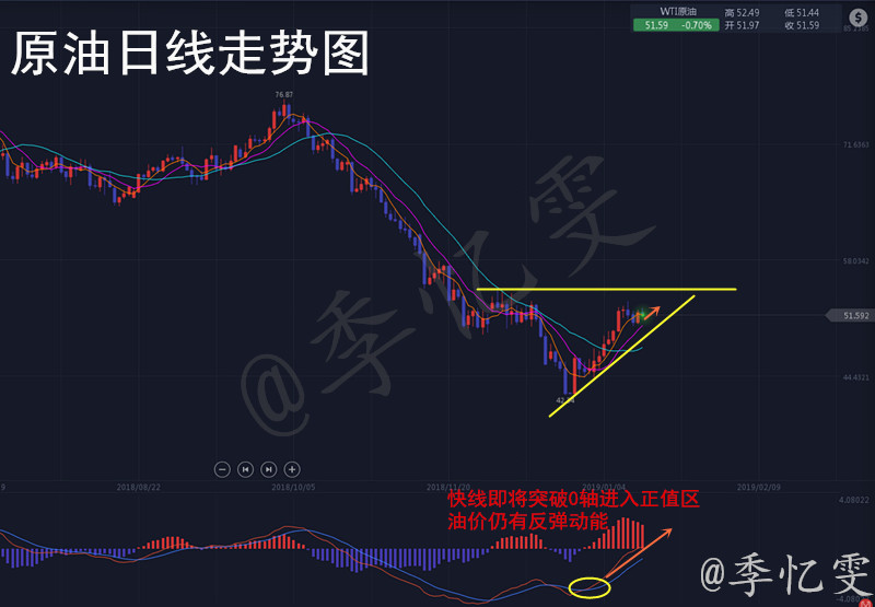 结合MACD和均线来看,21、34日均线死叉后出现平行,55日均线也在53.2压制着原油,89日均线继续向低位运行,均线来看原油跌势暂缓,想要继续上涨必须站上55日均线上方,附图MACD双线在0轴下方呈现金叉,快线即将突破0轴进入正值区也说明了原油仍有反弹空间,后市双线若能突破0轴进入正值区那么原油拿下53.2也只是时间的问题,若盘整太久原油多头力量也将会被消耗殆尽,综合来看原油短线走势偏向多头,