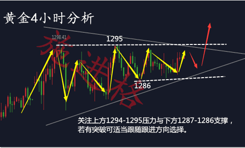2、下方回调1288区域附近做多,破1284止损,目标1293-1297附近;