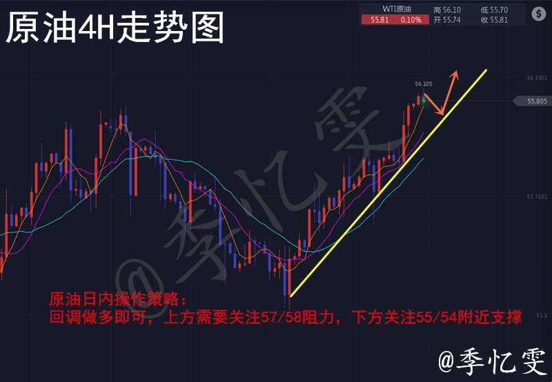 回调做多即可,上方需要关注57/58阻力,下方关注55/54附近支撑。