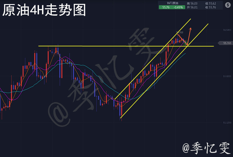 2、回调至55.0-55.2做多,止损0.4美元,目标55.8-56.0
