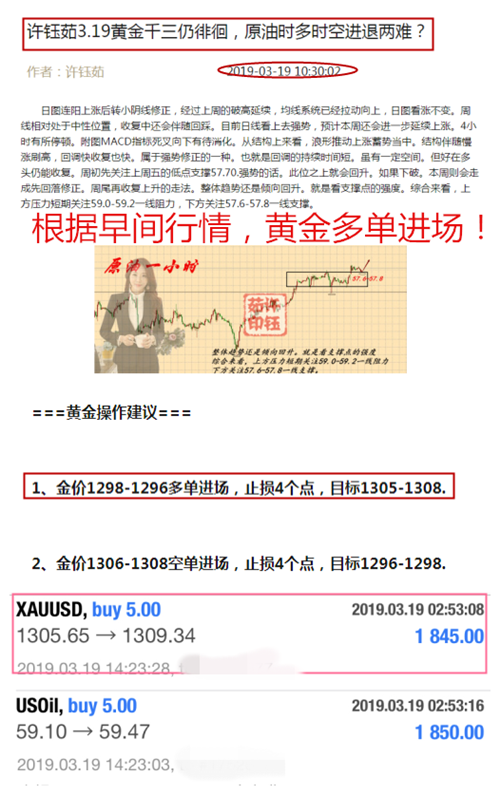 黄金亚欧盘一波上涨基本把全天的行情波动都走完了,接下来美盘可能就是长时间高位区间震荡整理。日内反弹做多思路非常明确,剩下的就是点位的问题。行情反反复复还挺考验耐心的,不过日内短线方向非常明确,只是行情波动偏小运行节奏偏慢,需要耐心持仓等待之后才有利空间,钰茹早间黄金1305附近多单进场,1309晚间获利出局,昨日黄金还是看涨还是不看跌,精准布局,收获也是一本万利。