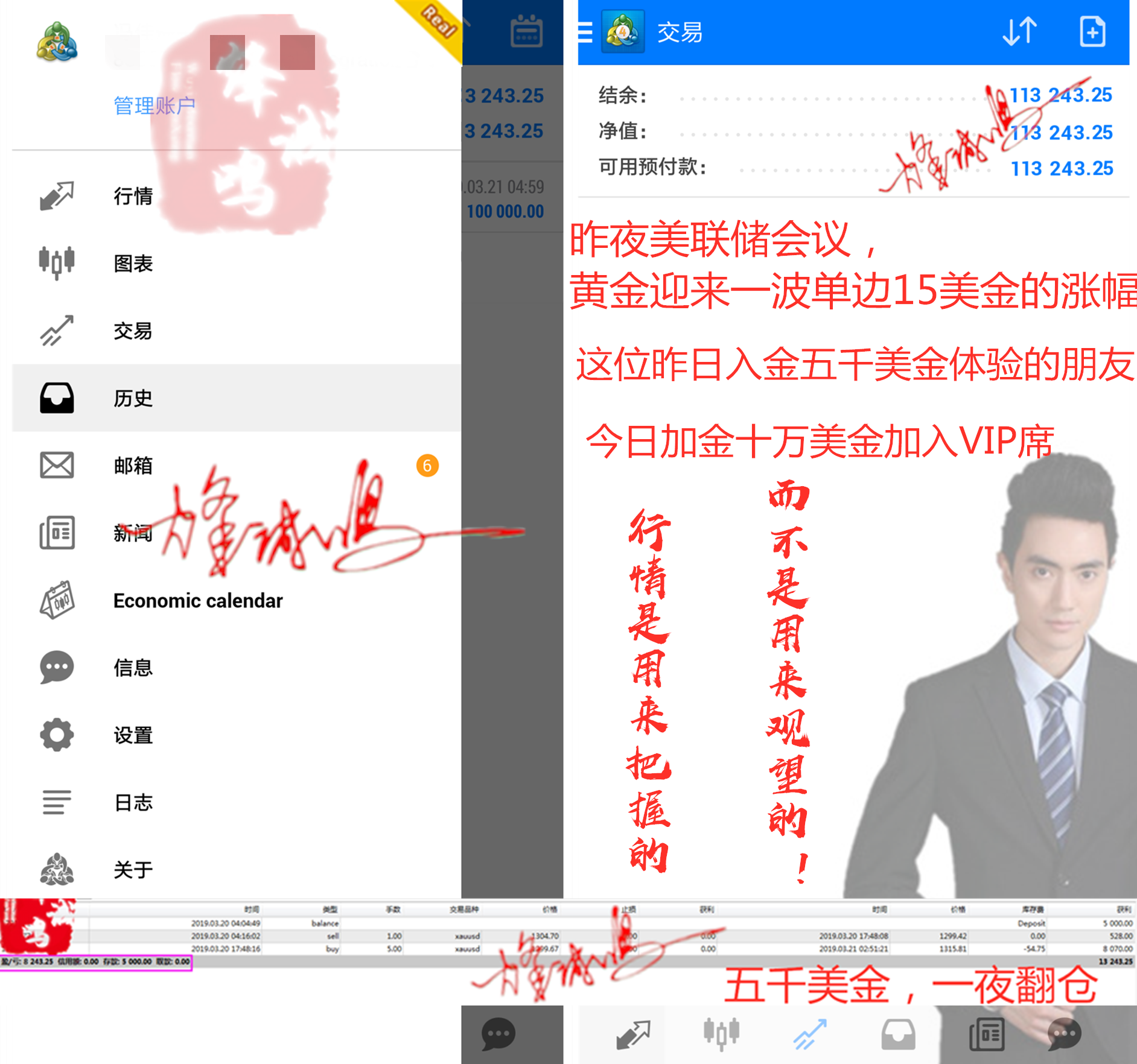 [p=null, 2, left] 李先生周三早间入金5千美金,刚好碰上美联储,结果一夜翻仓,次日直接加金十万美金,一夜翻仓是实力的体现,行情不分早晚,不分大小,只要有收益就是大行情,只要稳健就能翻仓,行情是用来把握的,而不是用来观望的。[/p]